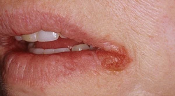 Такое состояние проявляется в виде трещин на губах, сопровождающихся покраснением и мелкими высыпаниями в центральной части. Язвы имеют красный оттенок, а губы становятся отечными и сухими.