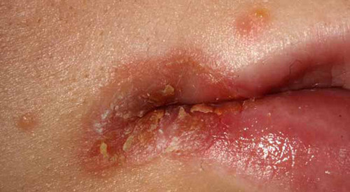 Если на губах оказывается грязь, воспаленный участок может покрыться корочкой и начать кровоточить. Обычно такая рана распространяется на зев и подбородок.