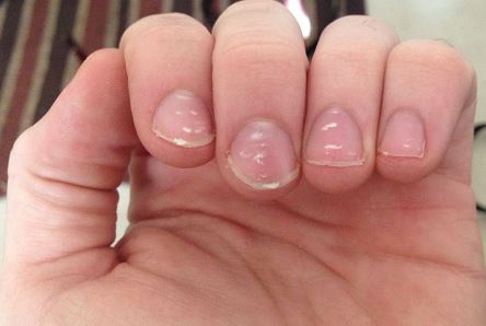 Цвет ногтей меняется: вместо здорового розового оттенка они желтеют или темнеют, а под ними могут появляться черные пятна. Кожа на верхних фалангах становится красной и воспаленной. Подобные изменения также наблюдаются на околоногтевом валике. Если не начать лечение, ноготь может полностью деформироваться.