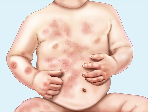 У детей разных возрастов эти симптомы могут проявляться на различных участках тела. У малышей до года покраснения и сыпь чаще всего возникают на лице и ягодицах. При развитии заболевания дети могут испытывать сильный зуд, что приводит к потере аппетита и нарушению сна. Часто симптомы усиливаются к вечеру. У некоторых детей при этом заболевании наблюдается белый налет на языке и склонность к запорам.