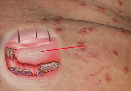 Первоначальная сыпь проявляется в виде мелких папул. Они могут образовываться как в одном месте, так и быть распределенными по различным участкам кожи. Степень выраженности сыпи не зависит от количества клещей, находящихся под кожей, а определяется силой аллергической реакции на продукты их жизнедеятельности.