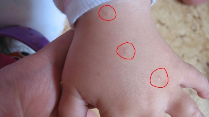У малышей в возрасте до одного года проявления болезни напоминают крапивницу. На коже образуется множество волдырей, покрытых кровянистыми корочками, а сыпь может появляться практически на всех участках тела, включая лицо и волосы. Дети более подвержены осложнениям, таким как пиодермия и дерматоз, чем взрослые.