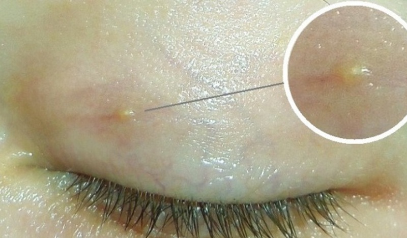 Эти новообразования имеют белый цвет с желтоватым оттенком. Они располагаются под кожей, при этом лишь их верхняя часть выступает наружу. Выдавливать такие образования не рекомендуется, так как это может привести к заносу инфекции, что в свою очередь вызовет гниение и покраснение в пораженной области.