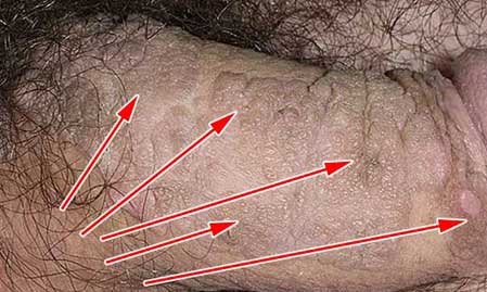 При травмах во время полового акта кожные покровы могут стать «воротами» для внедрения вируса. Различить остроконечные выросты от перламутровых папул, которые также находятся на коронке члена, но не являются заболеванием, достаточно просто, опираясь на фотографии: папулы имеют плотную текстуру и одинаковые размеры. В отличие от них, остроконечные кондиломы более мягкие и могут иметь разнообразные формы.