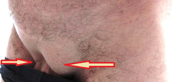 На начальных стадиях заболевания возникает небольшая припухлость, напоминающая маленький шарик, как показано на изображении. При пальпации эта припухлость ощущается мягкой и эластичной. С развитием патологии размер шарика увеличивается, и иногда он меняет свою форму. В положении лежа припухлость может исчезнуть, но стоит человеку встать, как она вновь появляется.