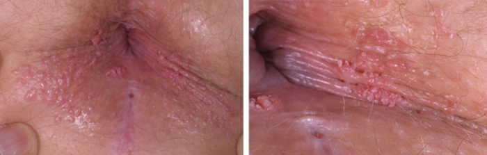Анальные кондиломы, как и другие подобные элементы на других частях тела, обычно имеют цвет кожи, чуть розоватый или более серый оттенок. Чаще всего форма кондилом сначала плоская, постепенно они вырастают и удлиняются. В том случае, когда очагу с кондиломами нет места для расширения, они начинают расти в длину.