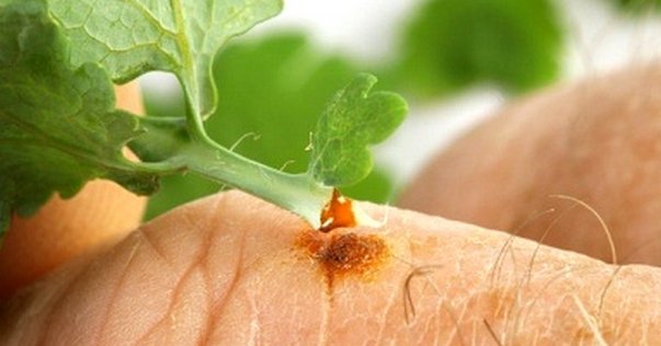 - Чистотел — можно приобрести сок чистотела в аптеке или использовать свежий сок растения. Наносить сок следует один раз в день, избегая попадания на кожу вокруг образования. При использовании аптечного препарата важно следовать инструкции.