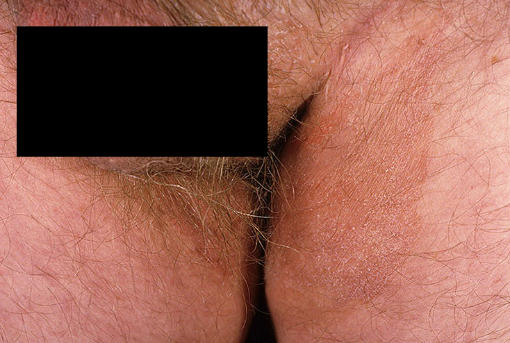 Заболевание затрагивает паховую зону, ягодицы, ногти и волосы. На представленных изображениях видно, что края плотных образований ярко-красного цвета обычно обрамлены пузырьками, а поверхность имеет неровную текстуру.