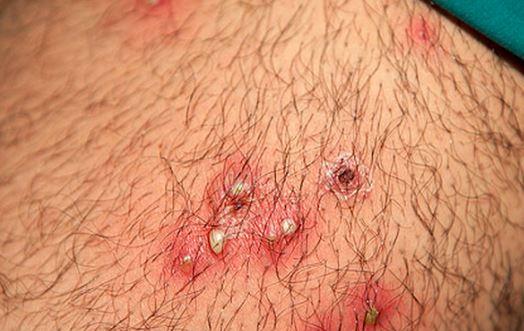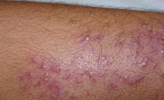 В зонах воспаления возникают мелкие зудящие пузырьки или волдыри.